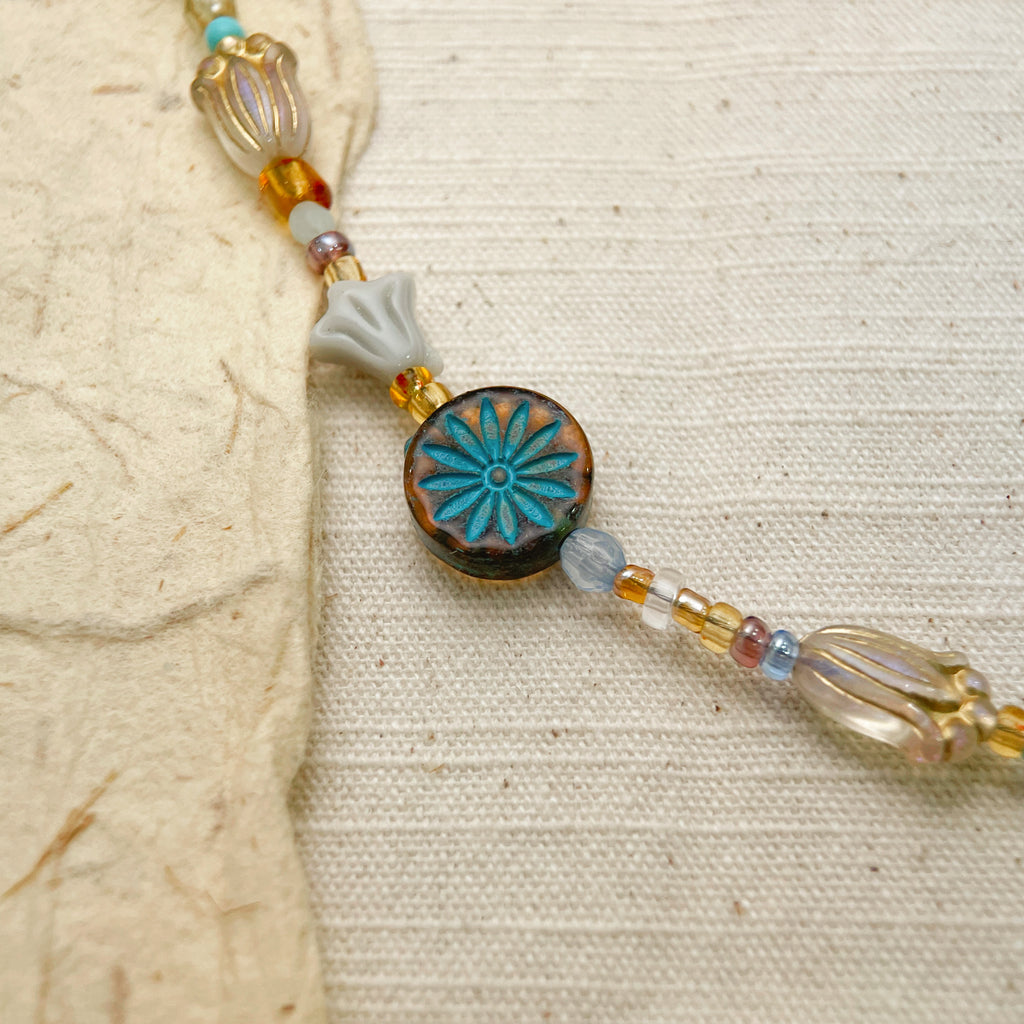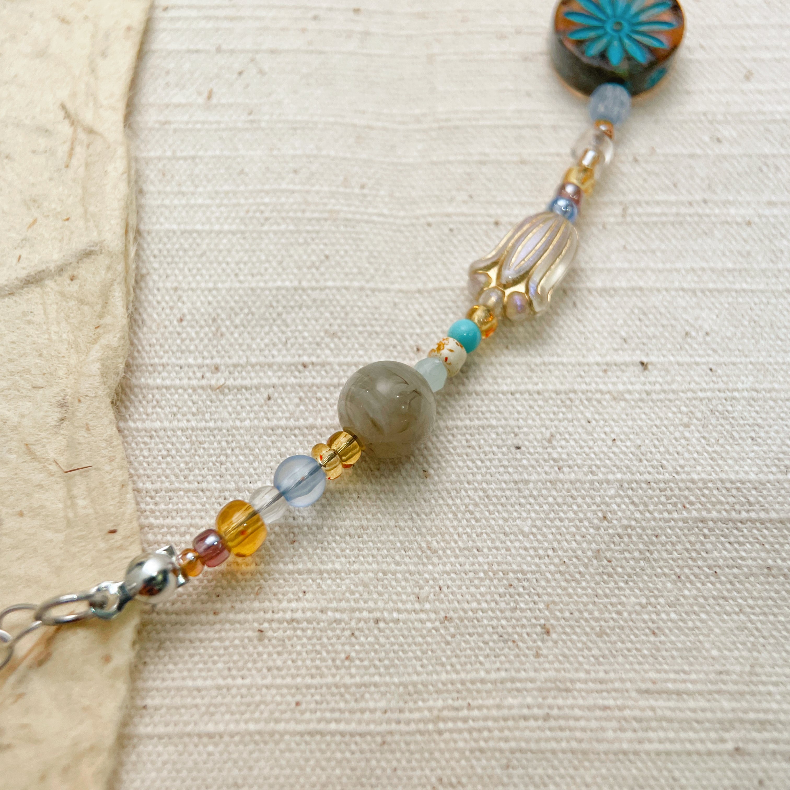 Infuse your style with warmth using this Handmade Bohemian Gemstone & Glass Bead Bracelet. Featuring a radiant mix of amber, turquoise, and golden hues centered around a delicate **turquoise floral charm**, this piece captures the joyful spirit of **boho soul jewelry**.