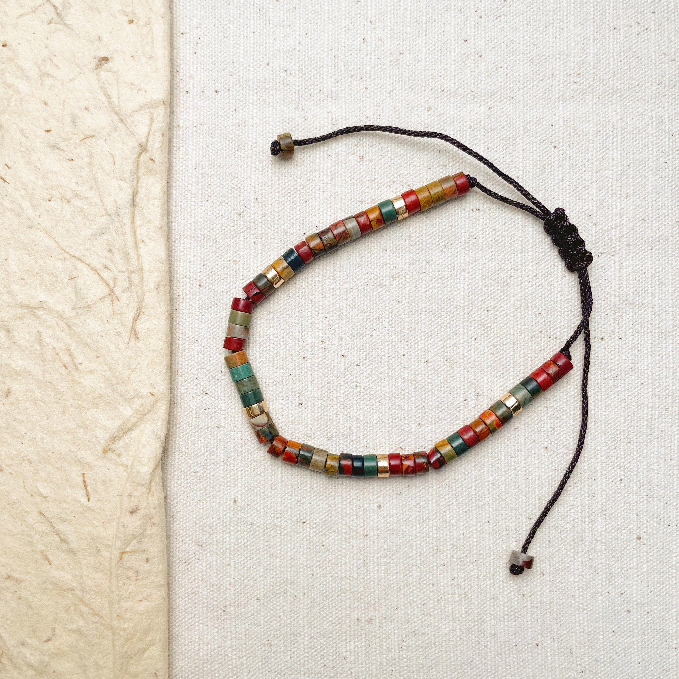 - Material: Natural Jasper, Metal Spacers, Nylon Cord