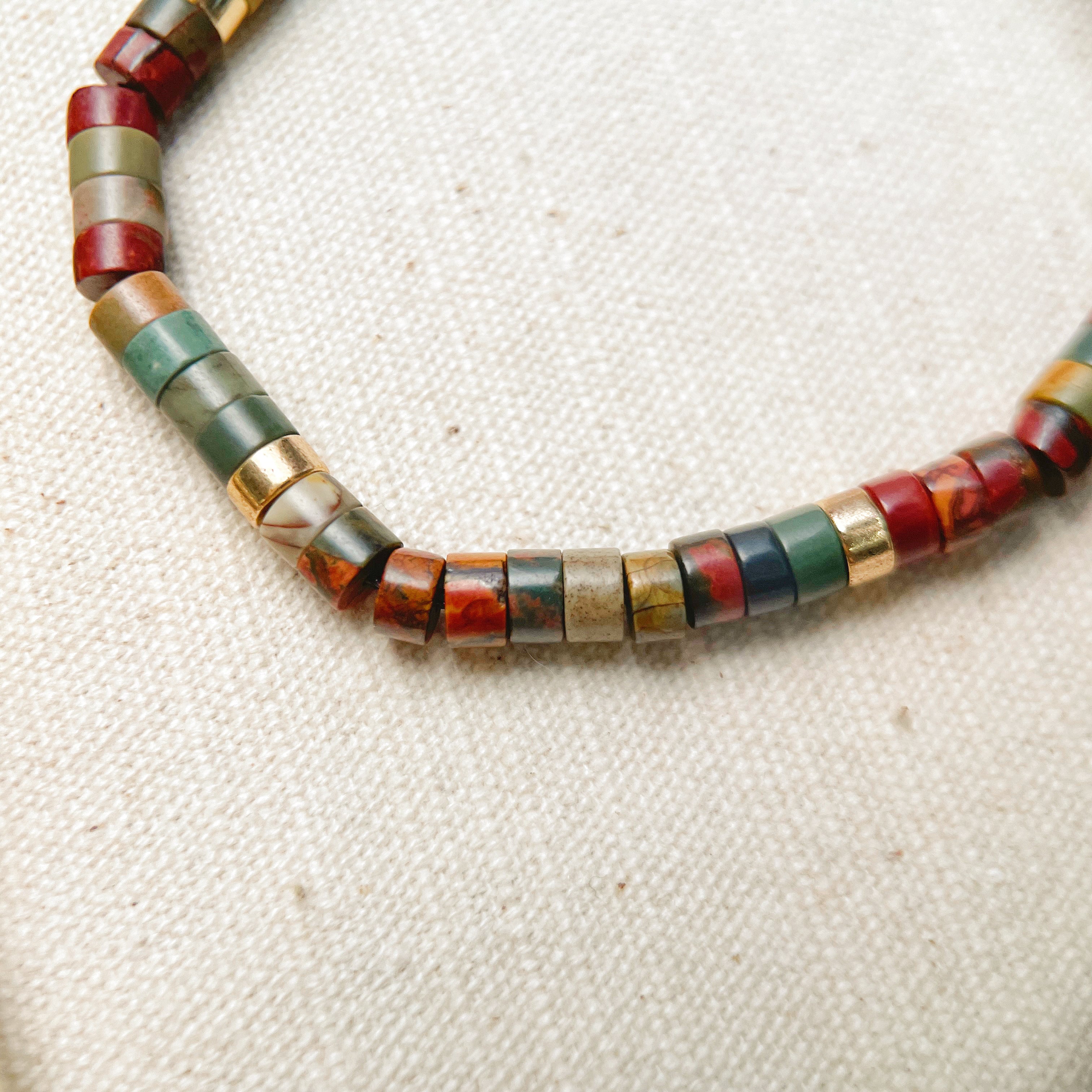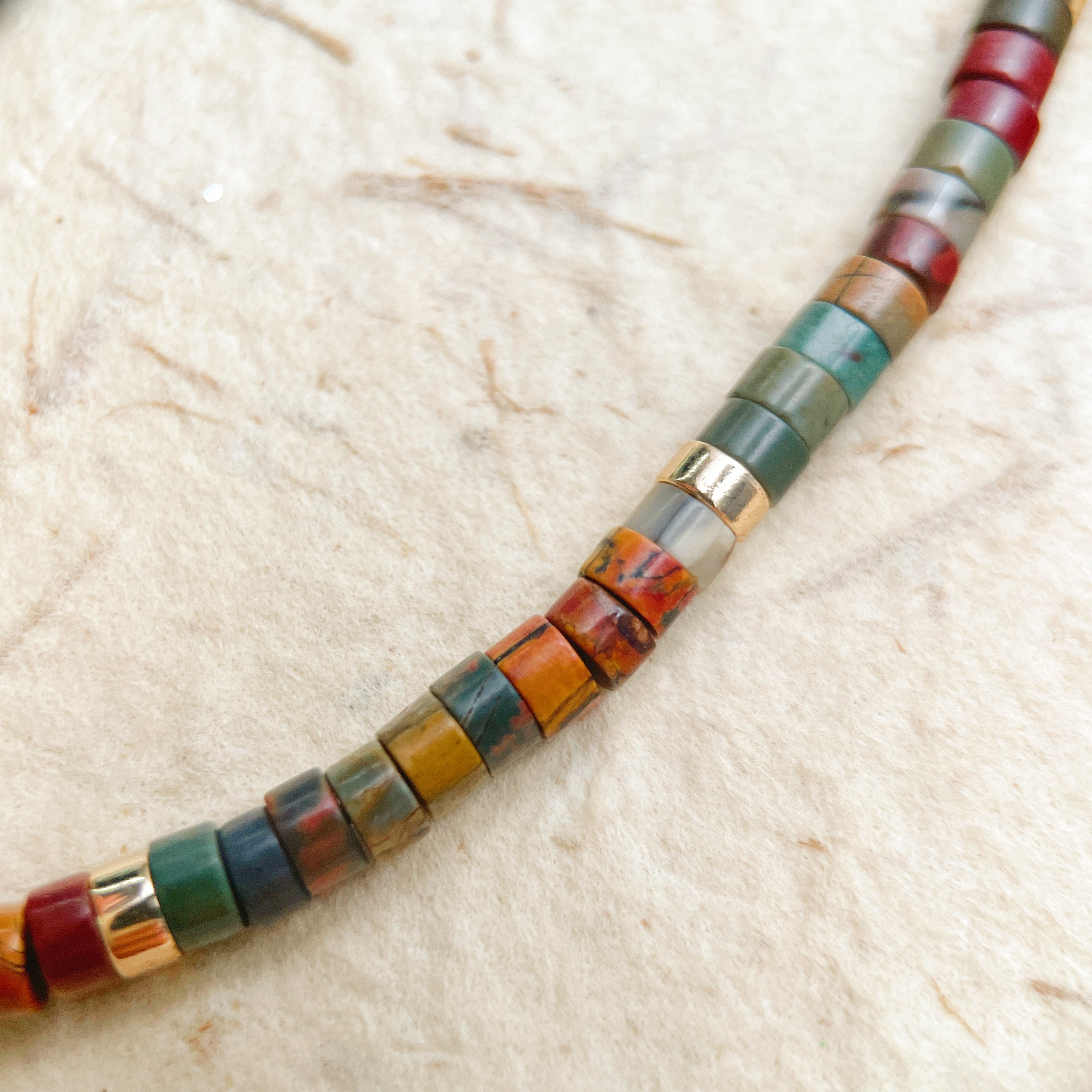 - Natural Stone Palette: Unique cylinder beads in deep red, forest green, mustard, and slate blue.