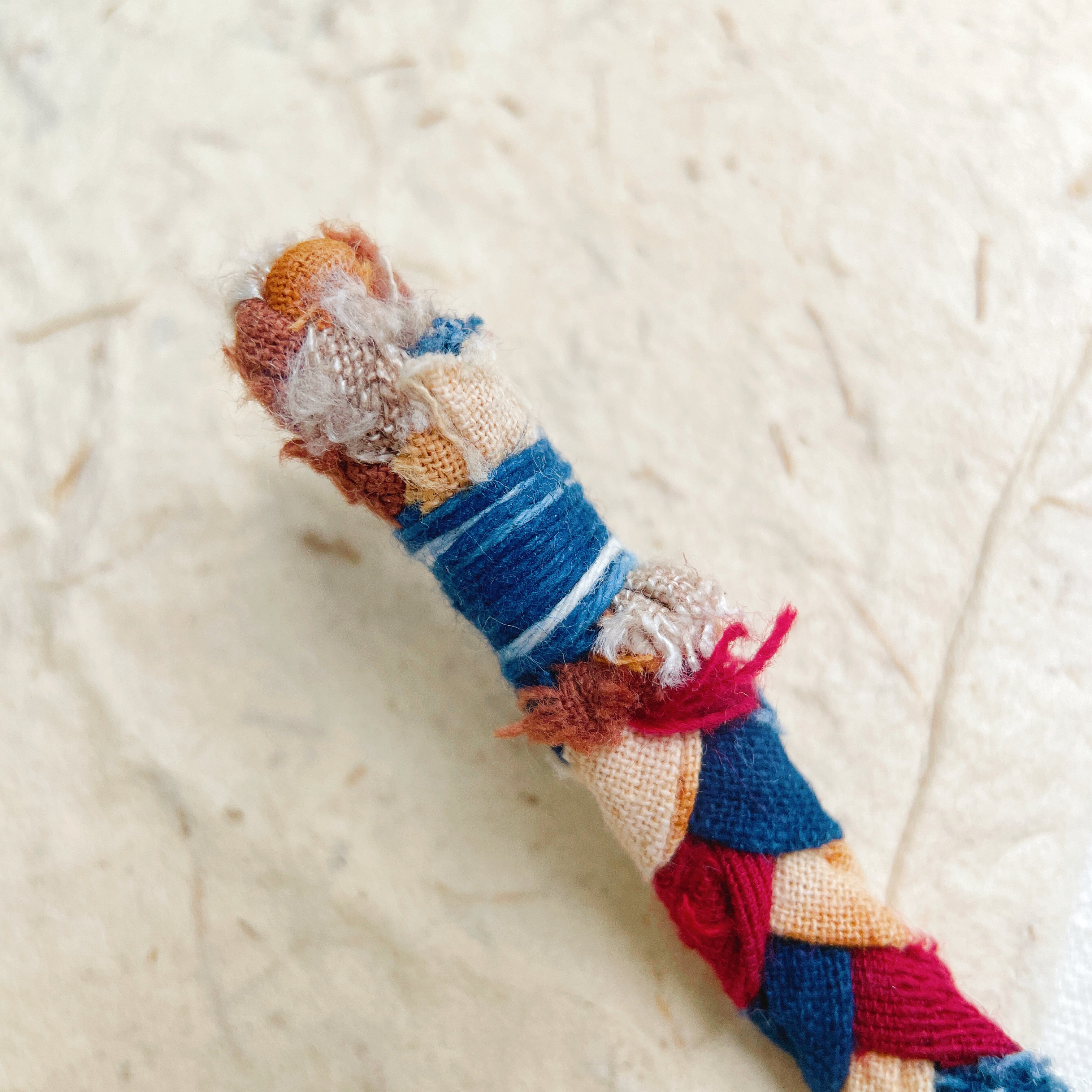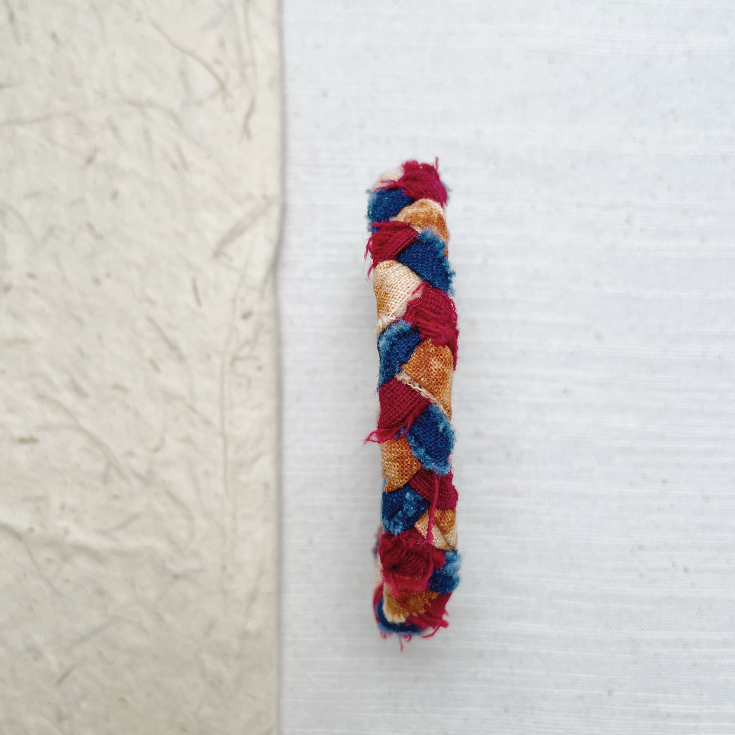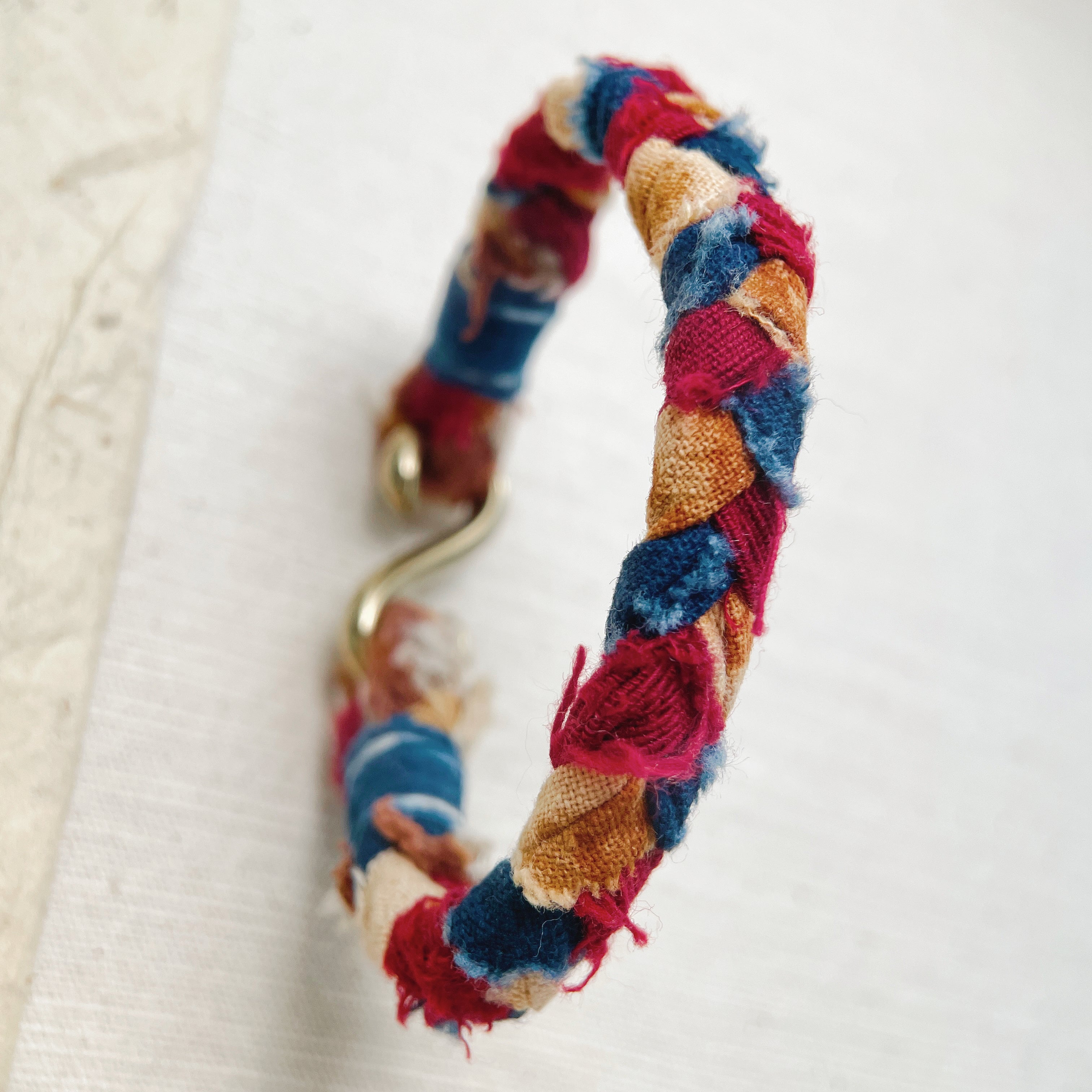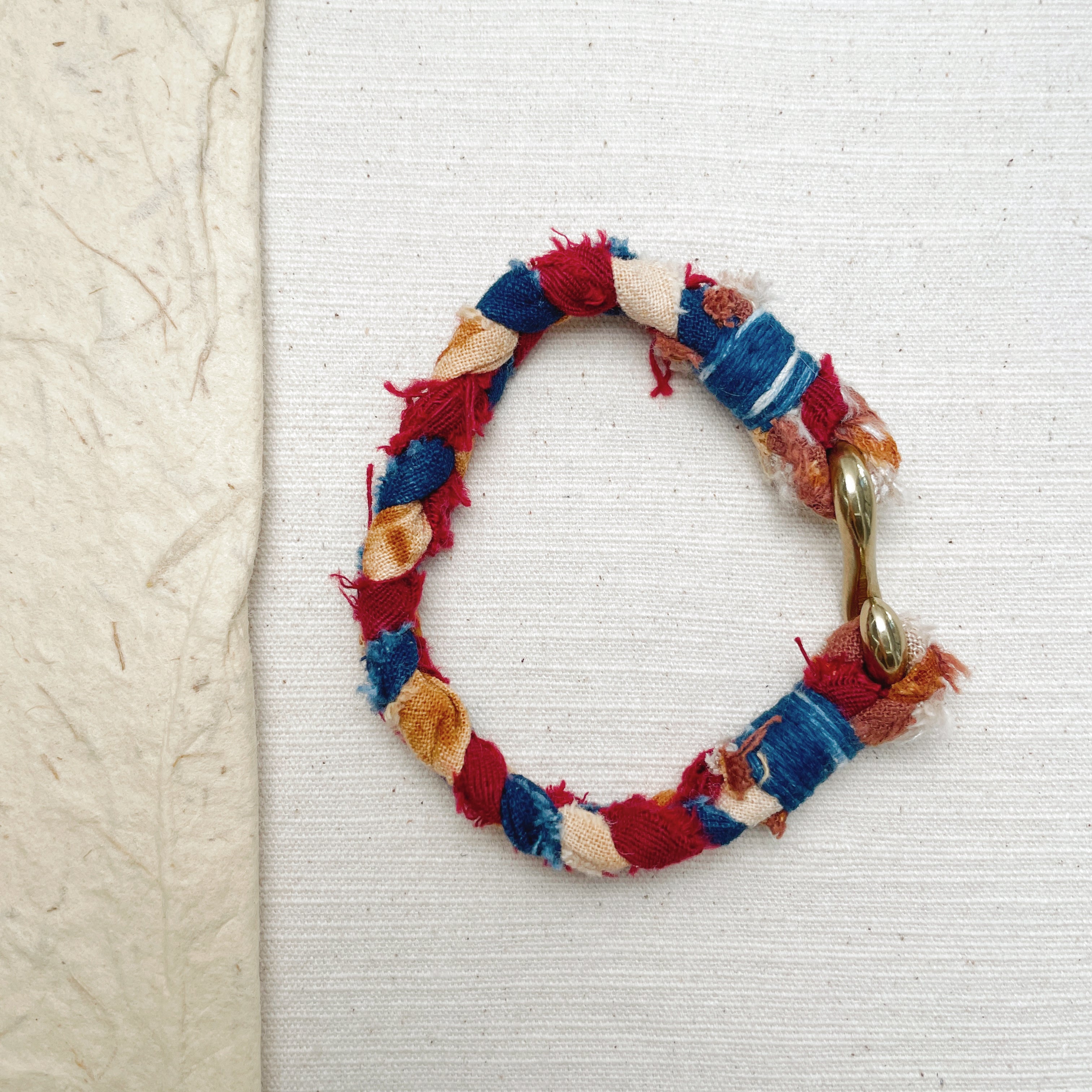 Celebrate artisanal texture with this Handmade Fabric Friendship Bracelet. Crafted from braided strips of **upcycled tie-dye fabric**, this piece blends **red, blue, and cream tones** for a vibrant, rustic look.