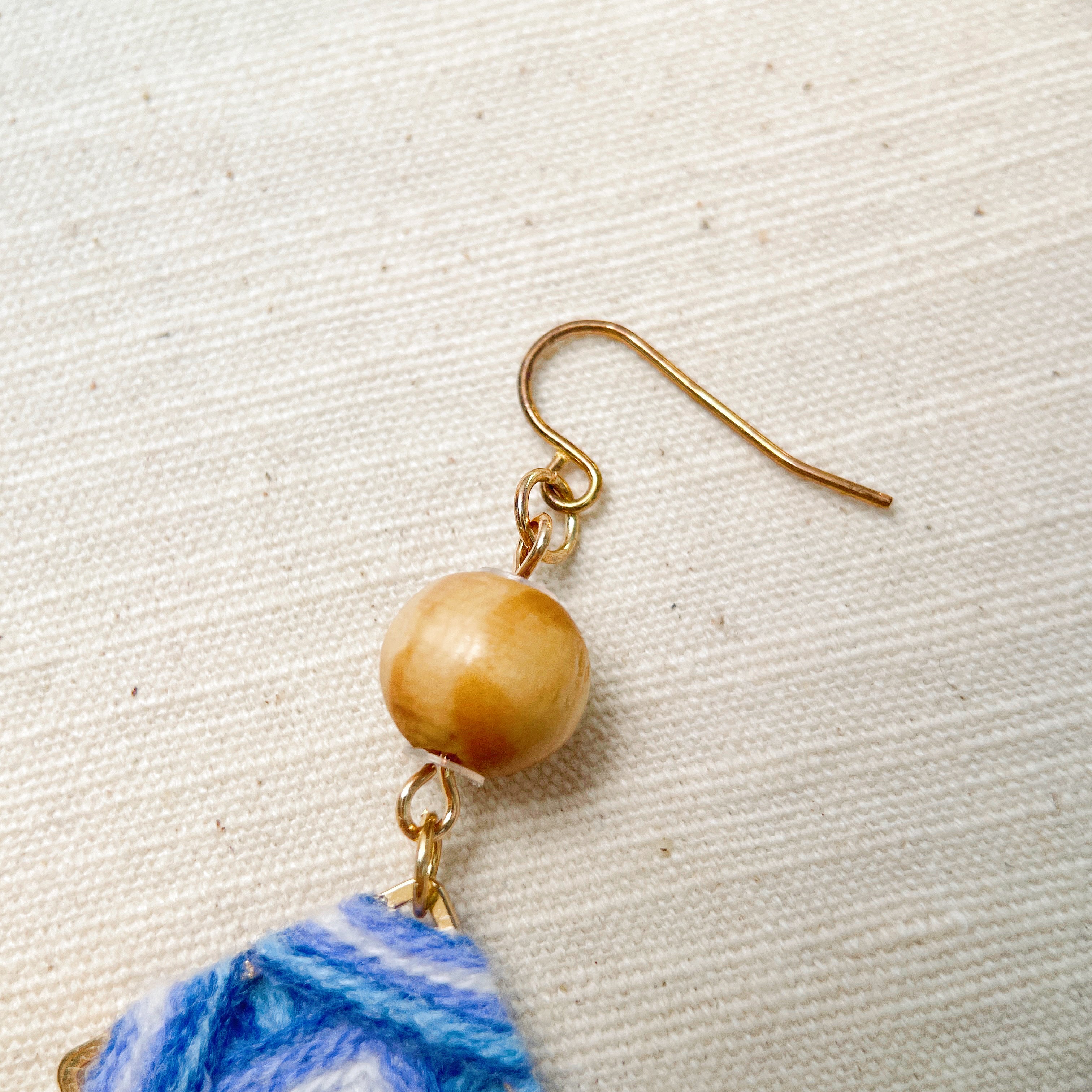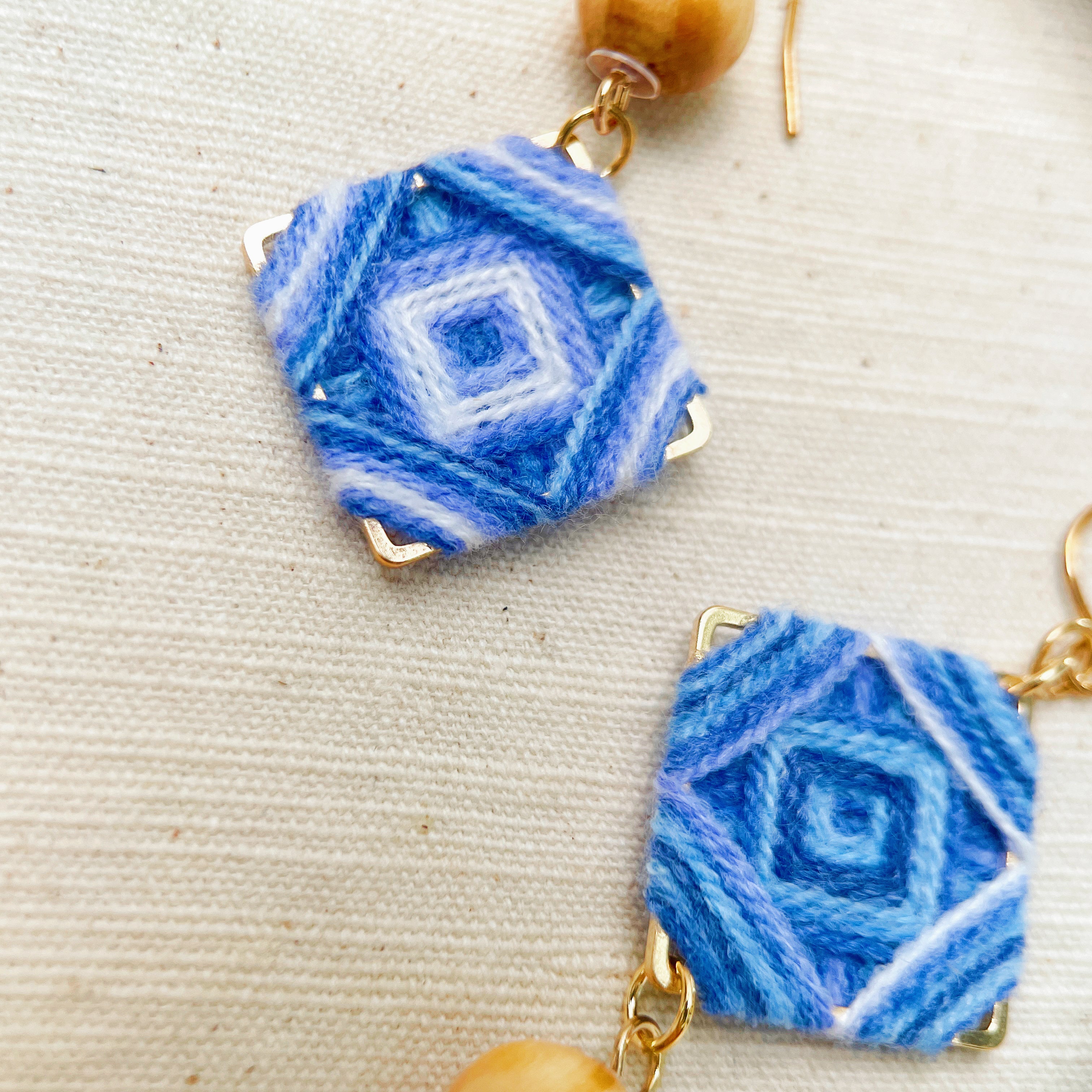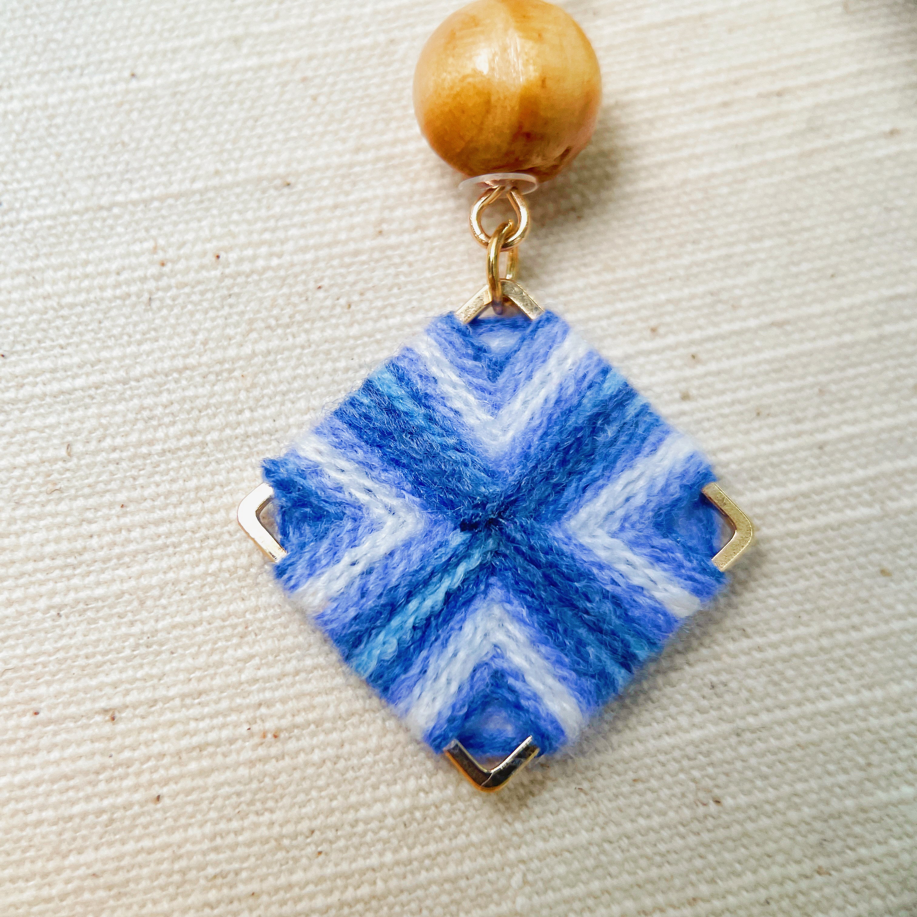 Blend textile warmth with modern design in these Handmade Folk Art Earrings. Featuring a **gold-tone square frame** meticulously wrapped in **blue and white yarn**, this pair is accented with a polished **natural wood bead** for an earthy finish.