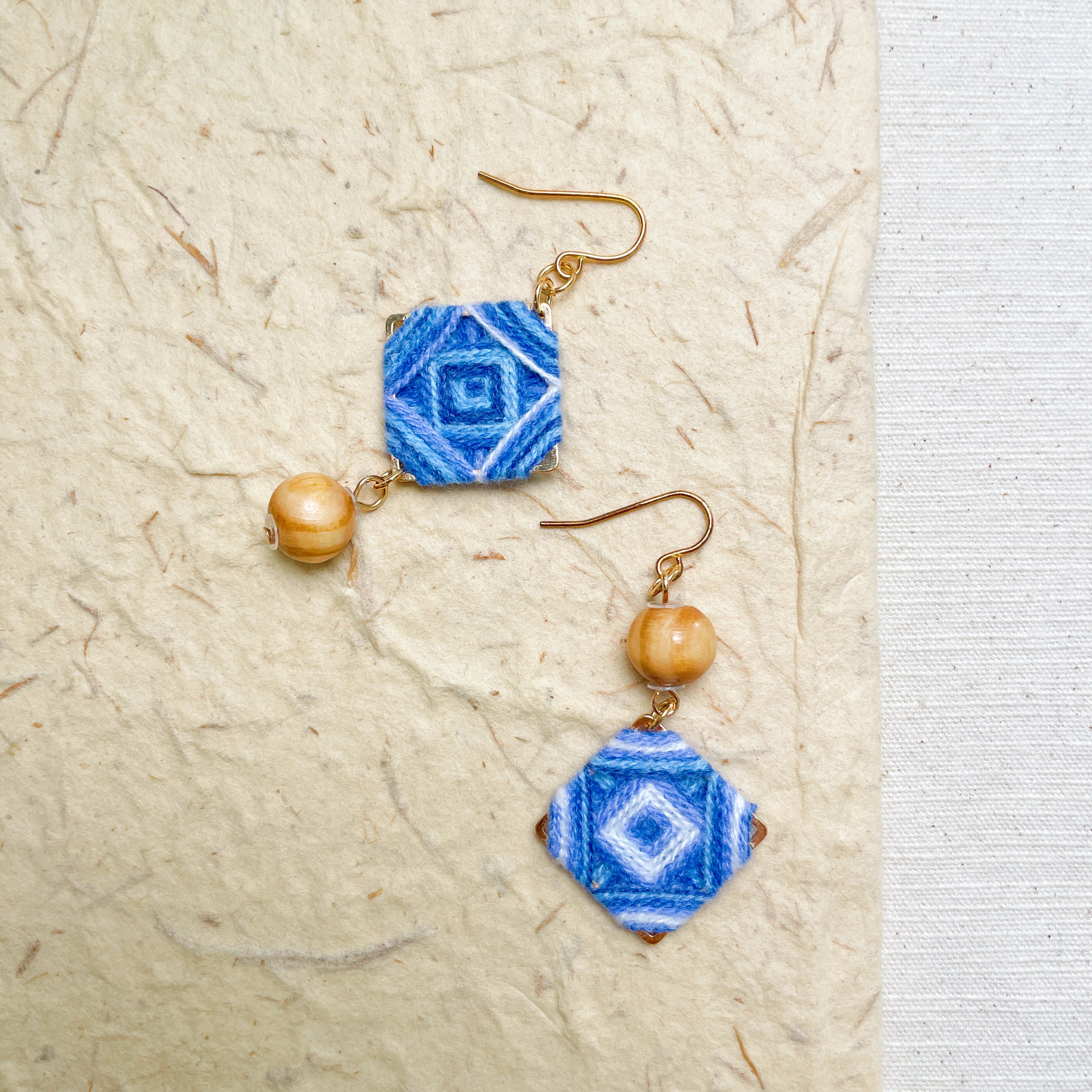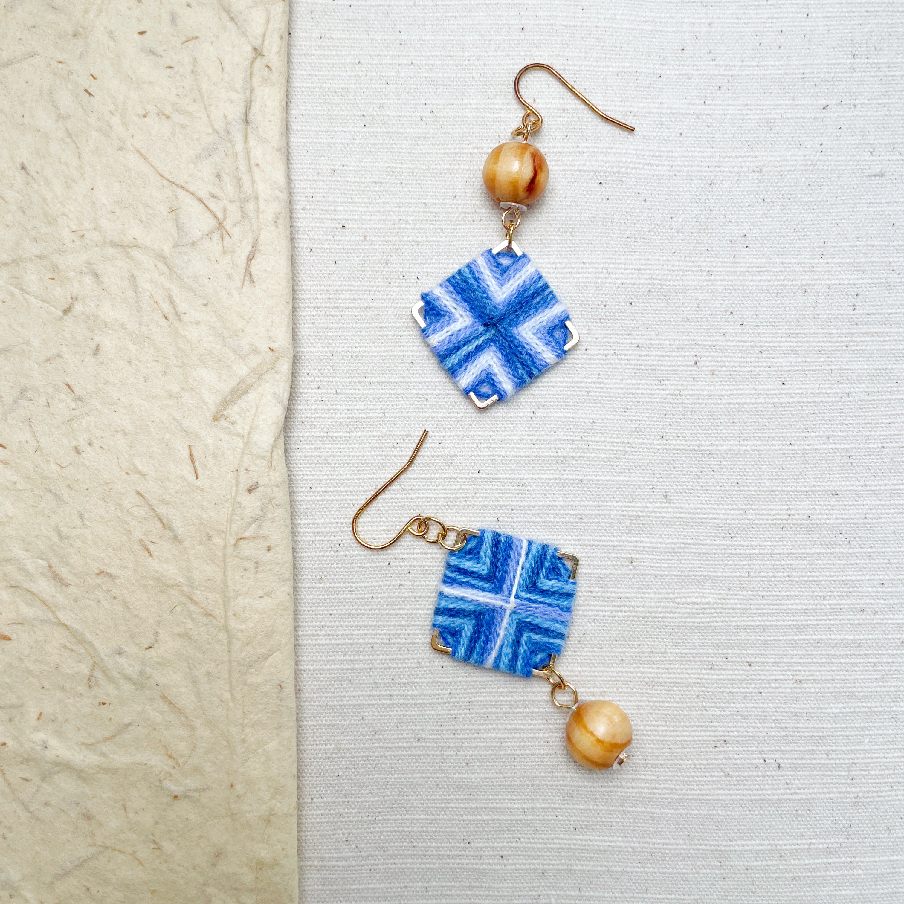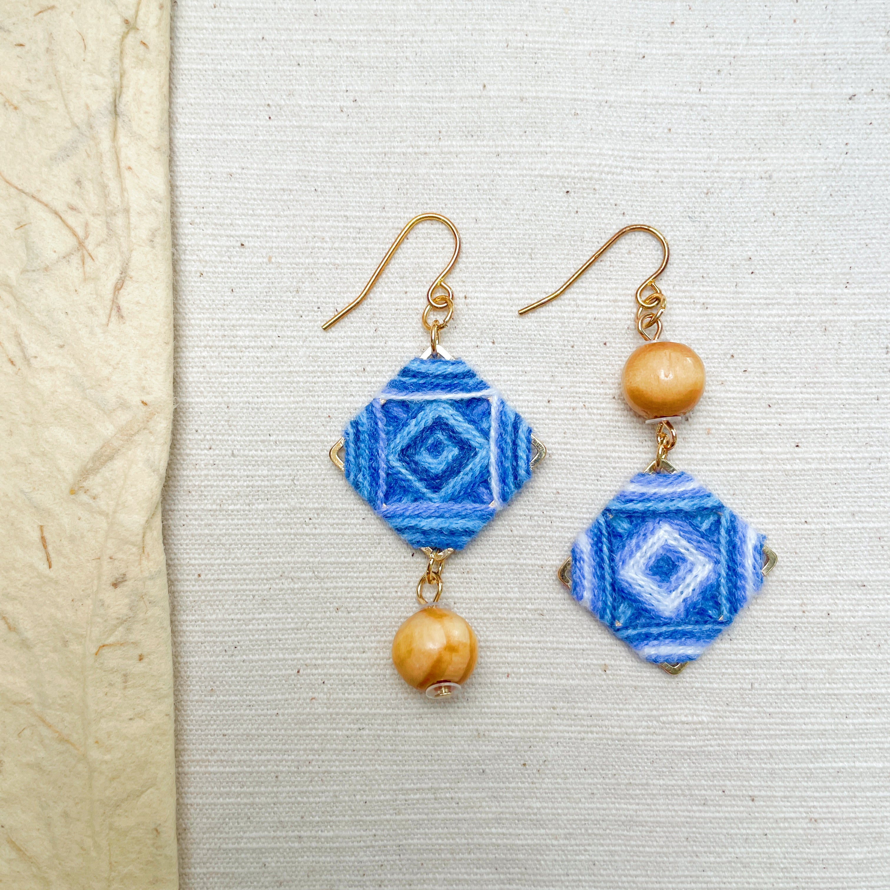 Blend textile warmth with modern design in these Handmade Folk Art Earrings. Featuring a **gold-tone square frame** meticulously wrapped in **blue and white yarn**, this pair is accented with a polished **natural wood bead** for an earthy finish.