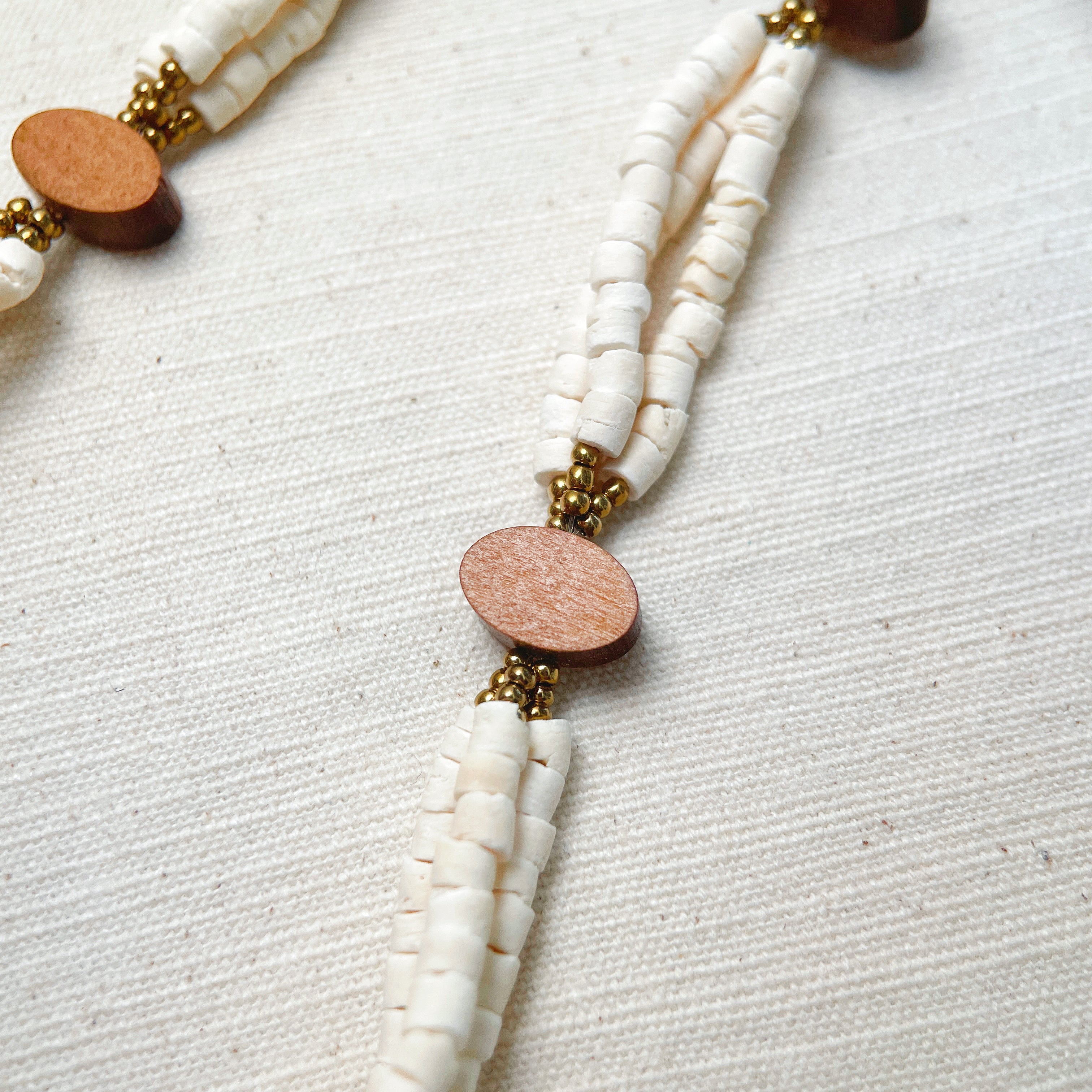 Embrace a clean, organic aesthetic with this Handmade Shell & Wood Layering Necklace. Featuring strands of **white shell heishi beads** punctuated by large, polished **dark brown wood discs**, this piece offers a refined take on **coastal boho jewelry**.