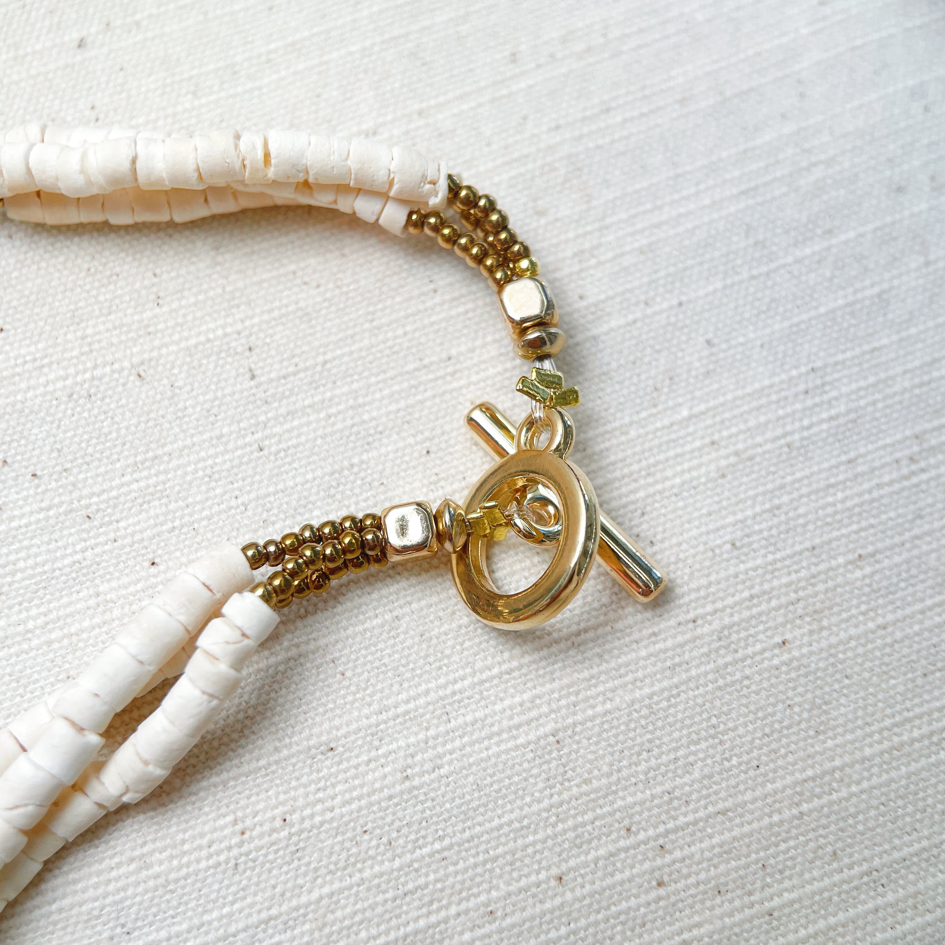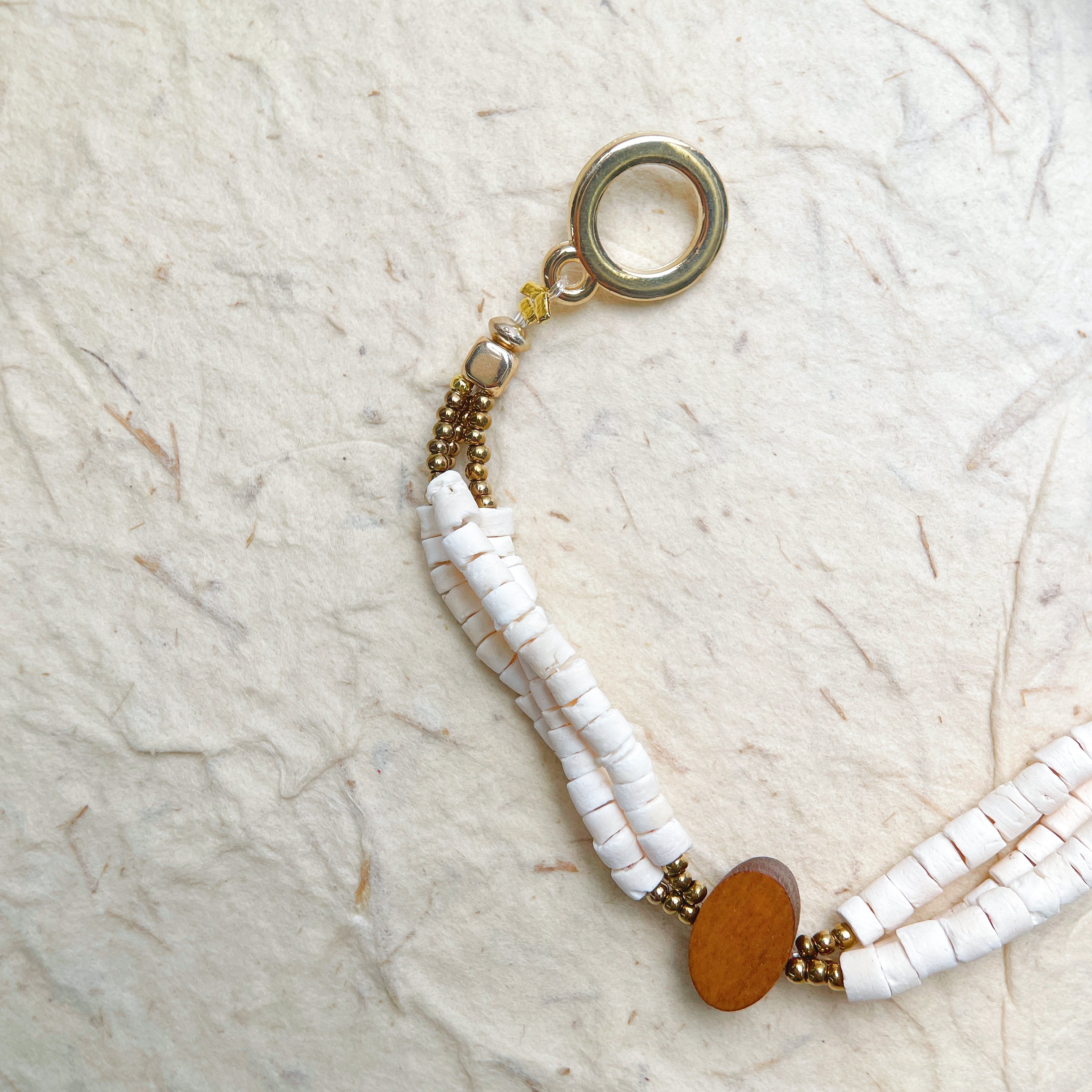 • Materials: Shell Heishi, Wood, Gold-Tone Alloy