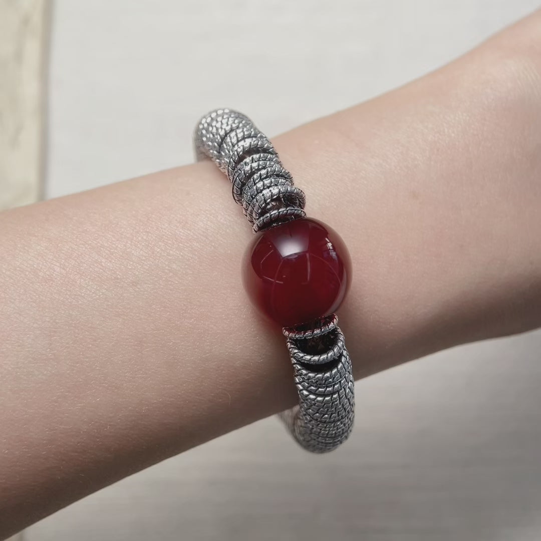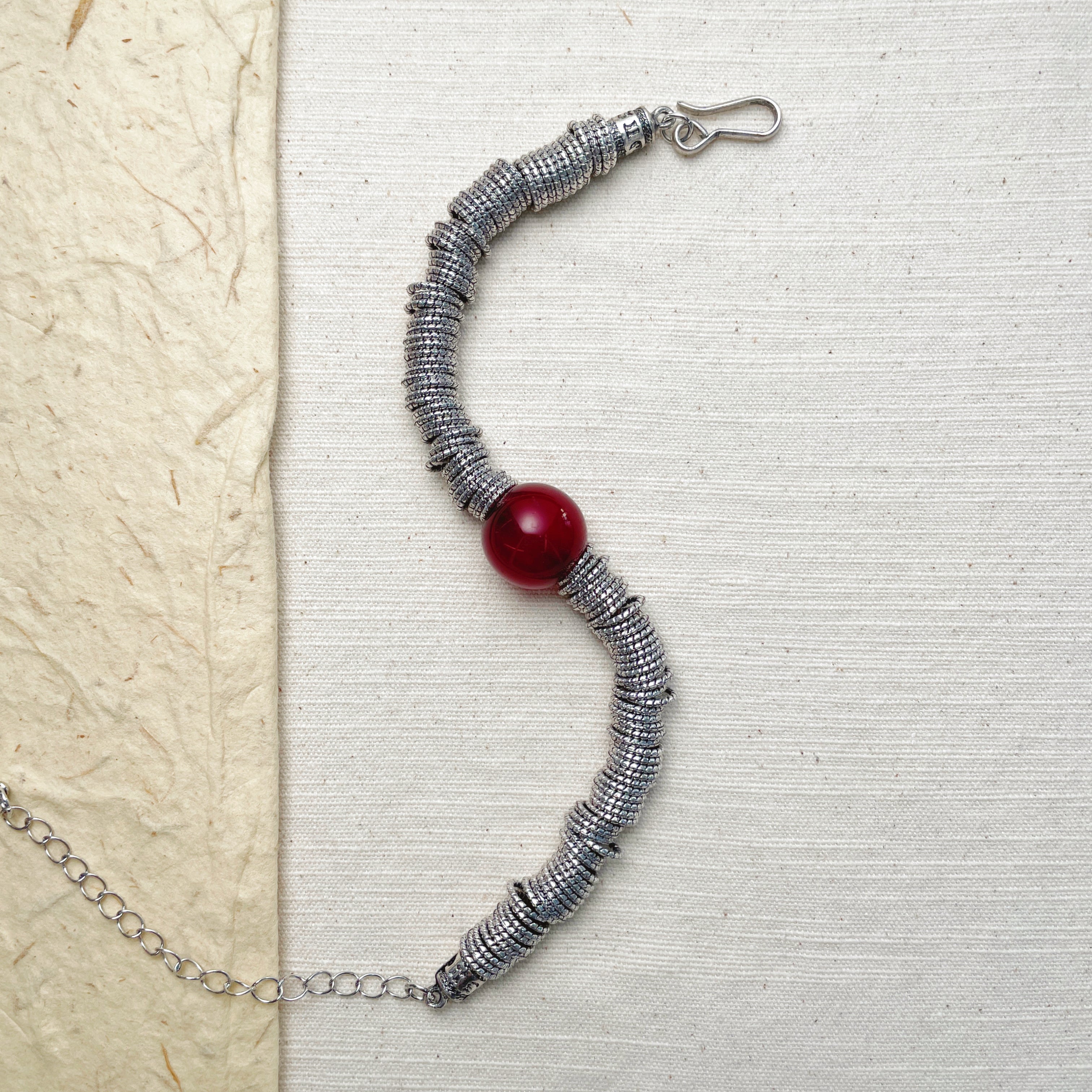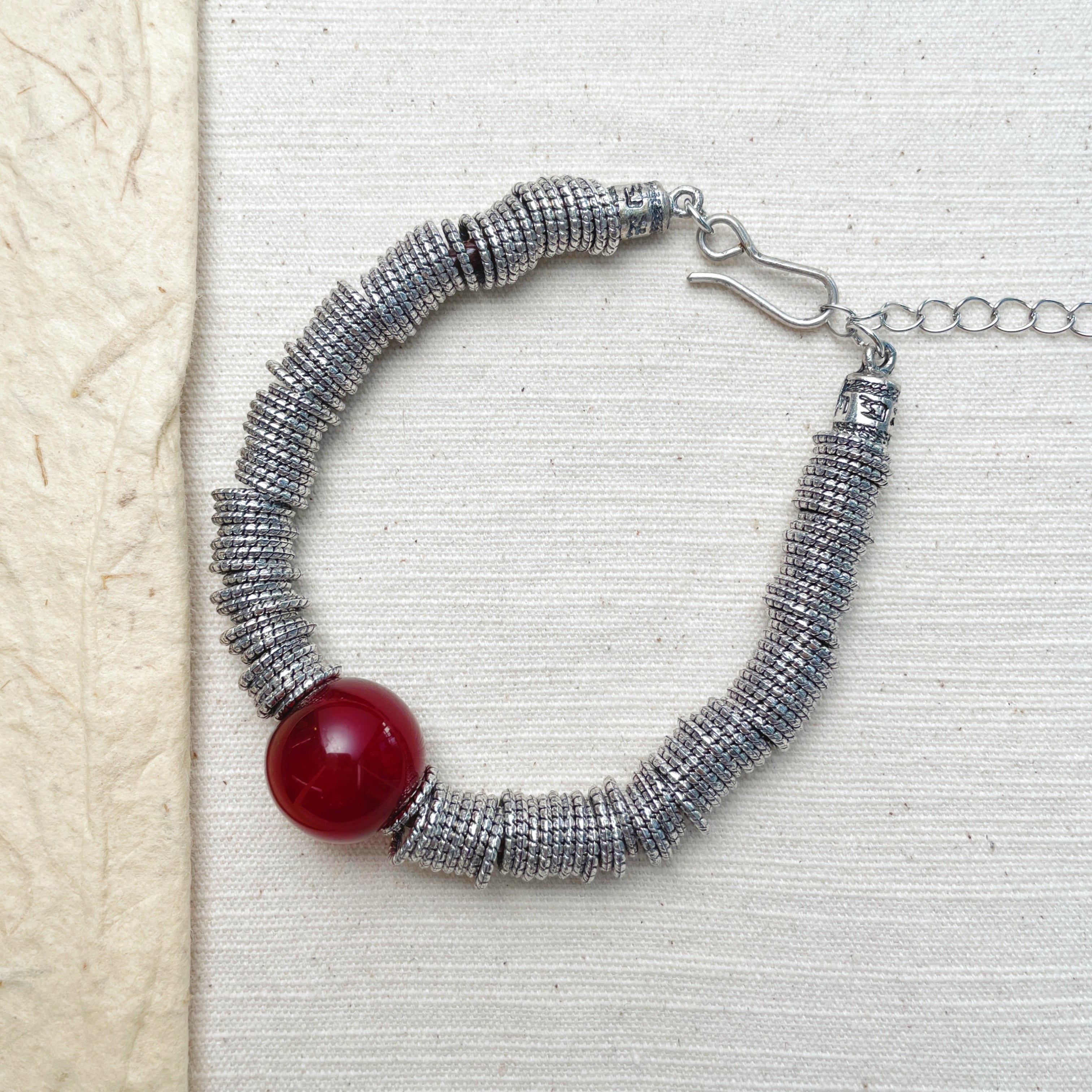 A polished **red carnelian-style bead** serves as the focal point, adding a warm pop of color to the cool metal structure.