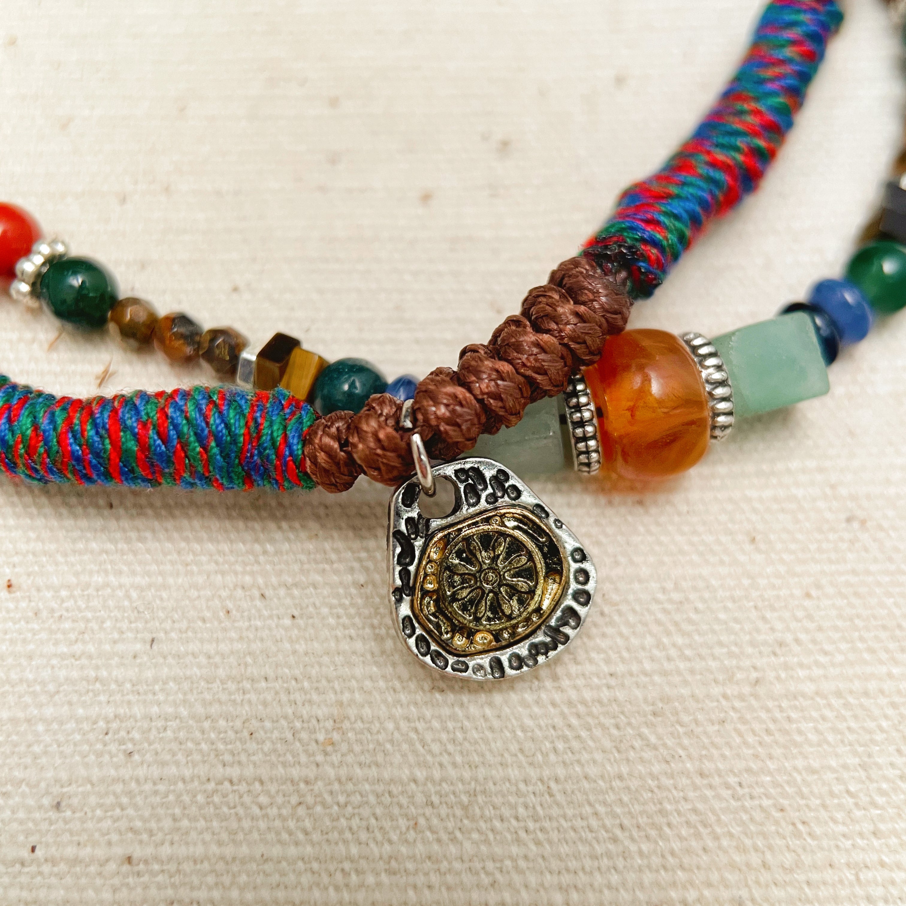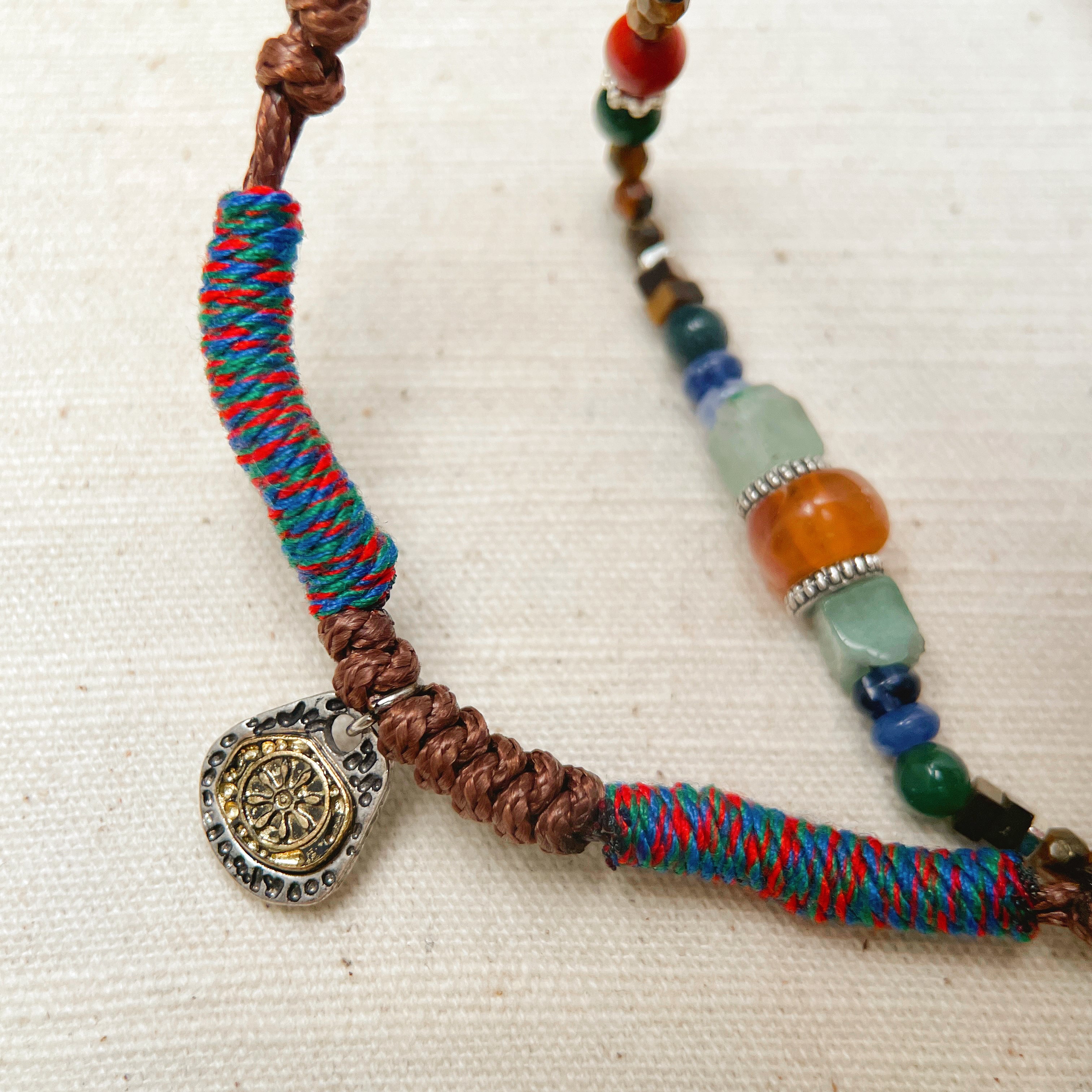 Embrace spiritual harmony with this Handmade Tibetan Style Bracelet. Featuring a meaningful blend of **Five Elements gemstones**—including Tiger's Eye, Red Agate, and Green Aventurine—this piece is anchored by a two-tone **Lucky Coin / Dharma Wheel pendant**.