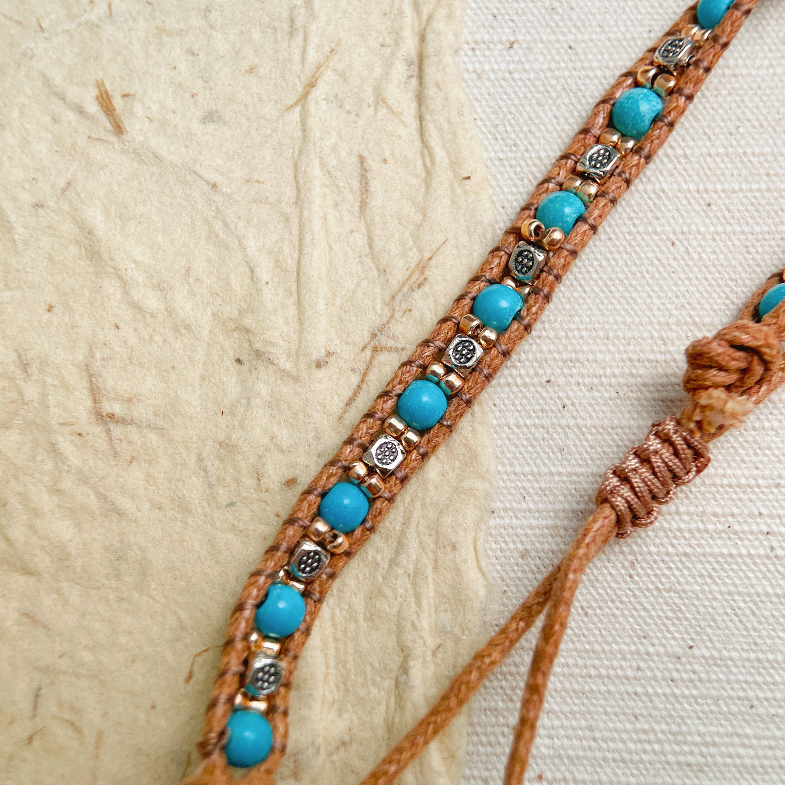 Capture the carefree energy of summer with this Handmade Turquoise Beaded Bracelet Set. Blending the tranquil blue of turquoise beads with the rustic texture of **tan leather cords** and playful glass accents, this set is the definition of **coastal boho jewelry**.
