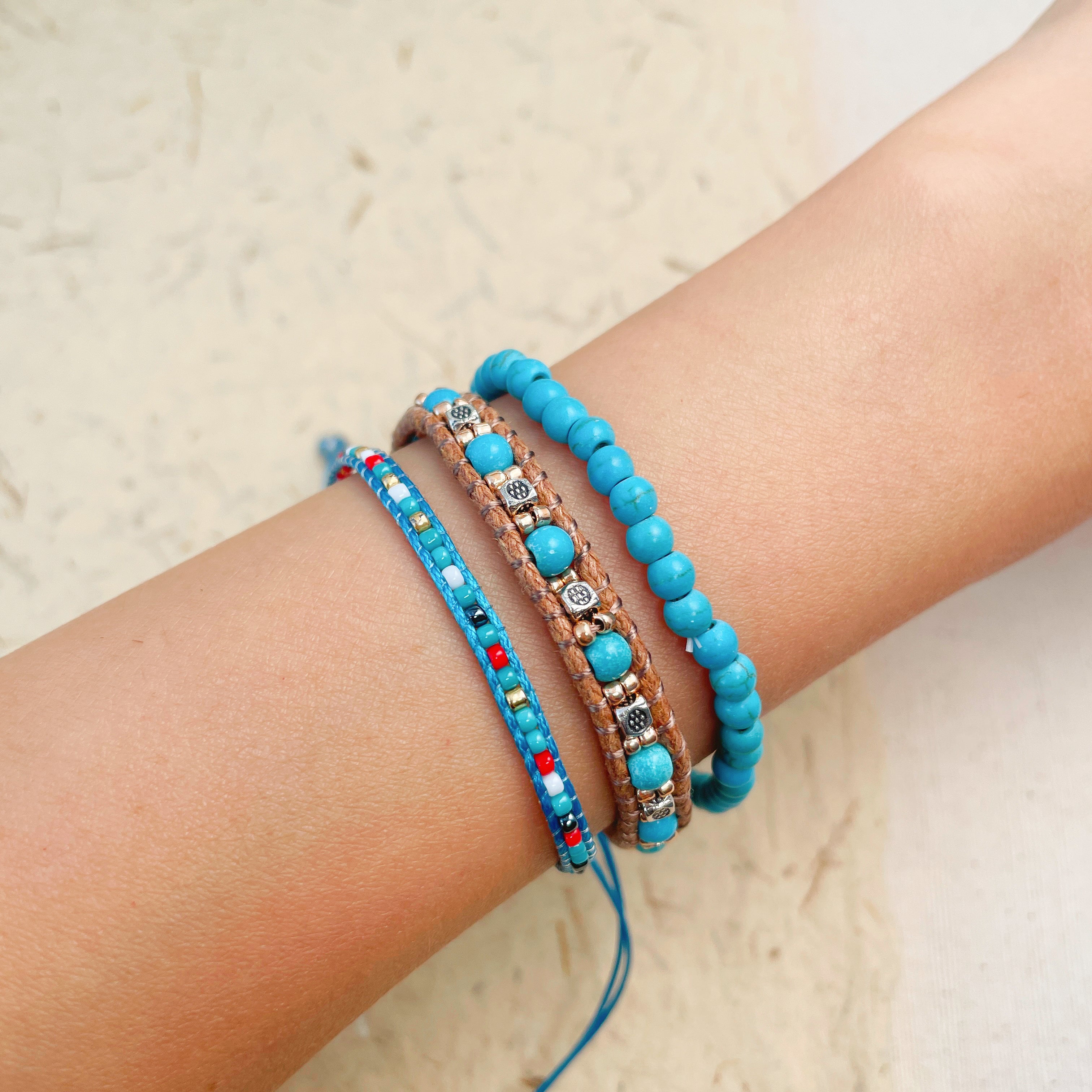• Effortless Layers: A curated mix of smooth turquoise beads, woven leather, and colorful seed beads creates an instant stacked look.