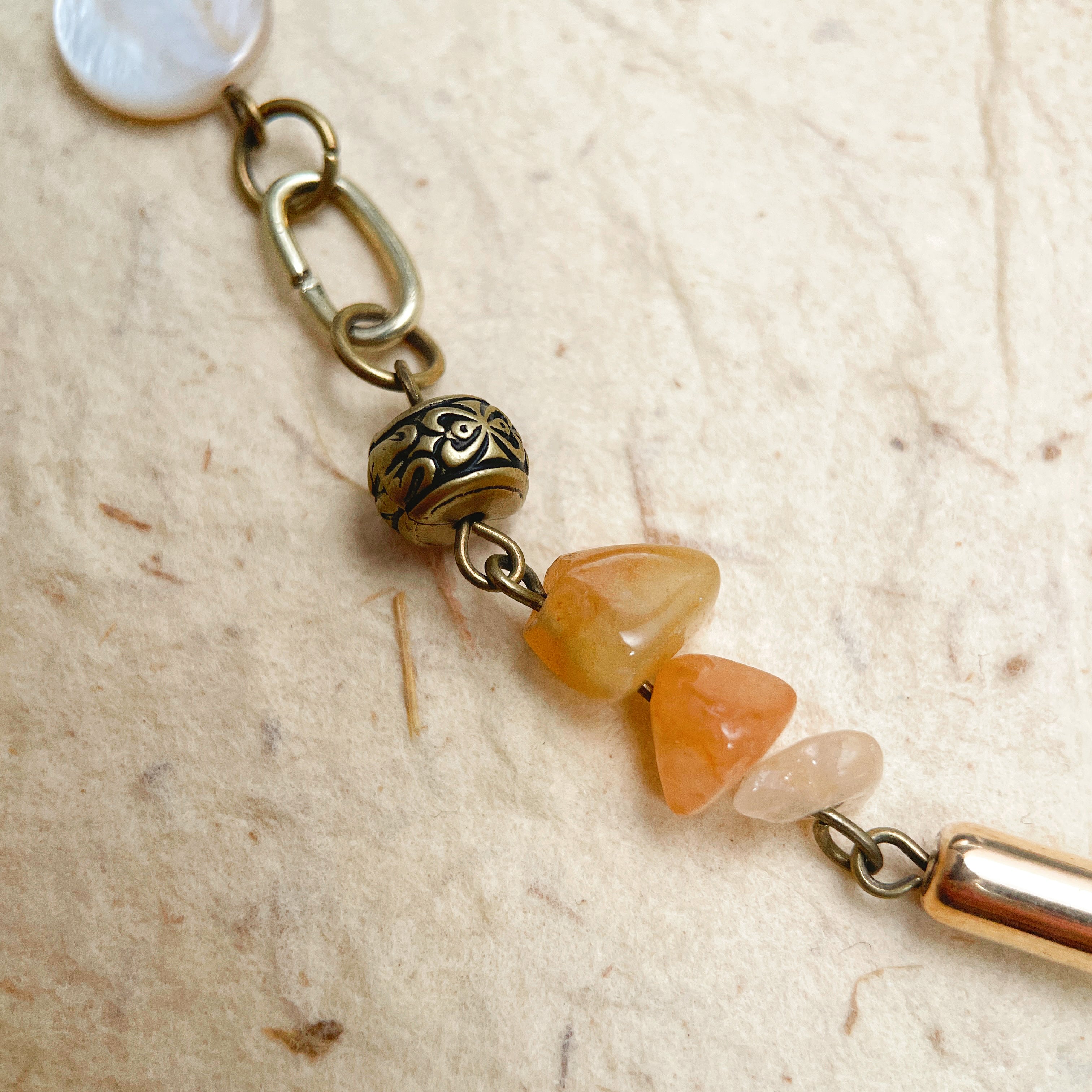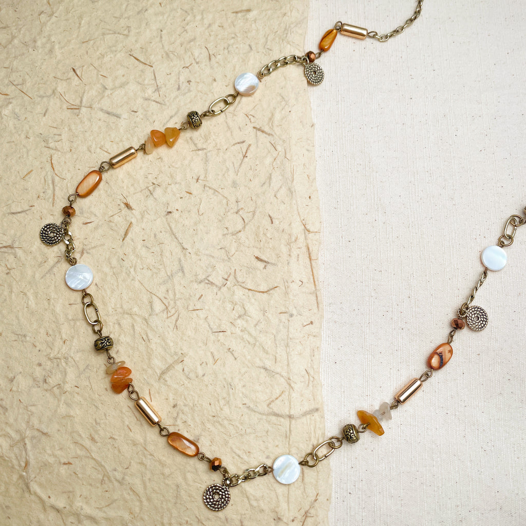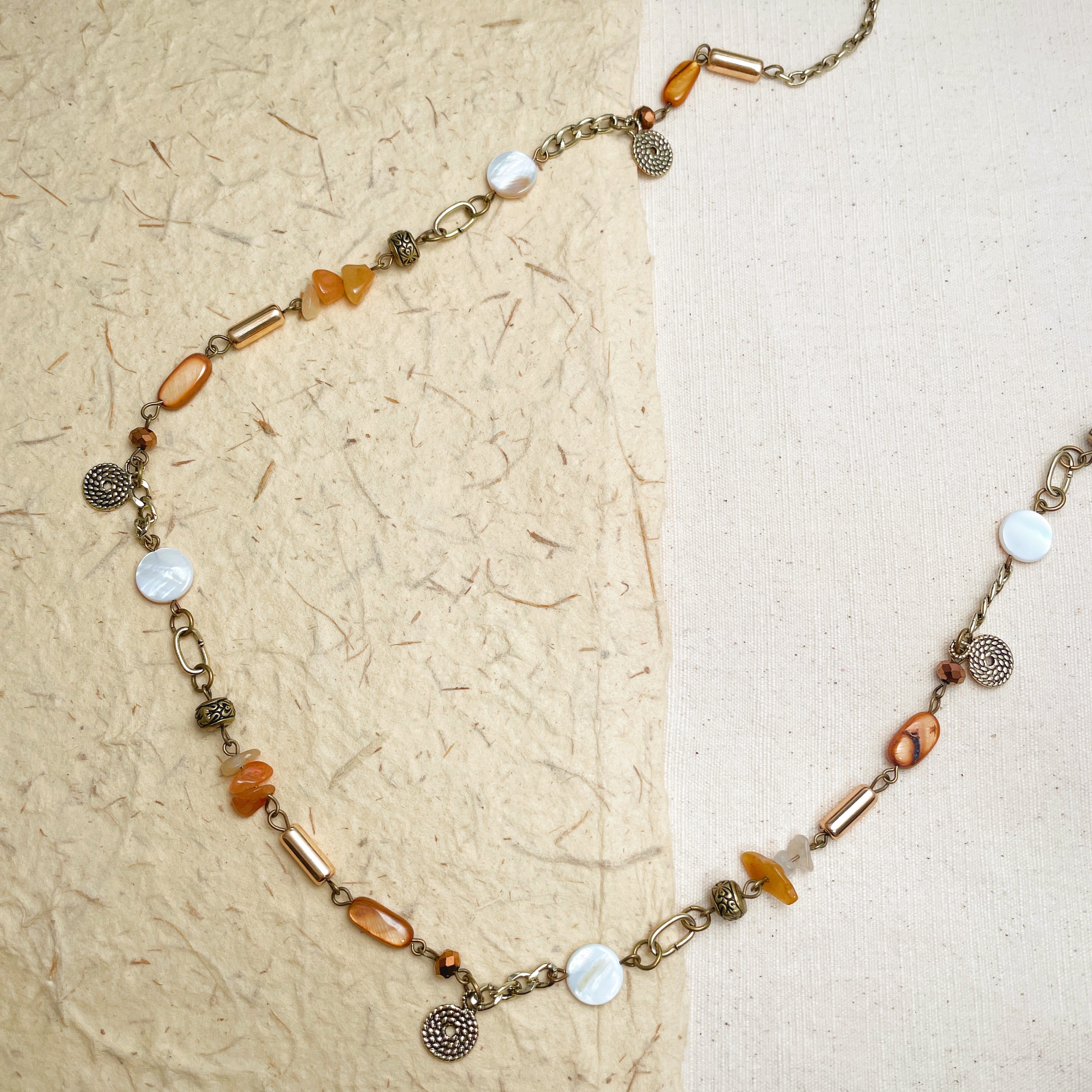 This handmade necklace combines natural gemstones, mother-of-pearl accents, and antique-style metal chains for a timeless boho look. The warm tones of amber, ivory, and brass evoke the grounding beauty of nature and the nostalgia of handcrafted vintage adornments. Each bead and charm adds texture and meaning, celebrating individuality and connection to the earth.