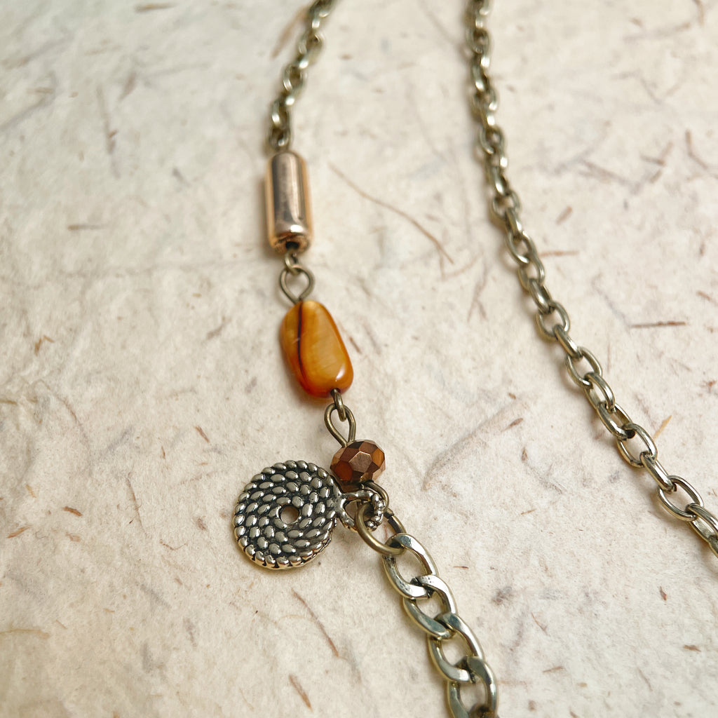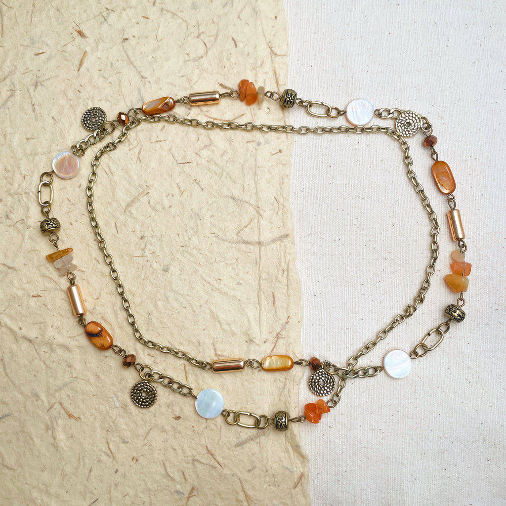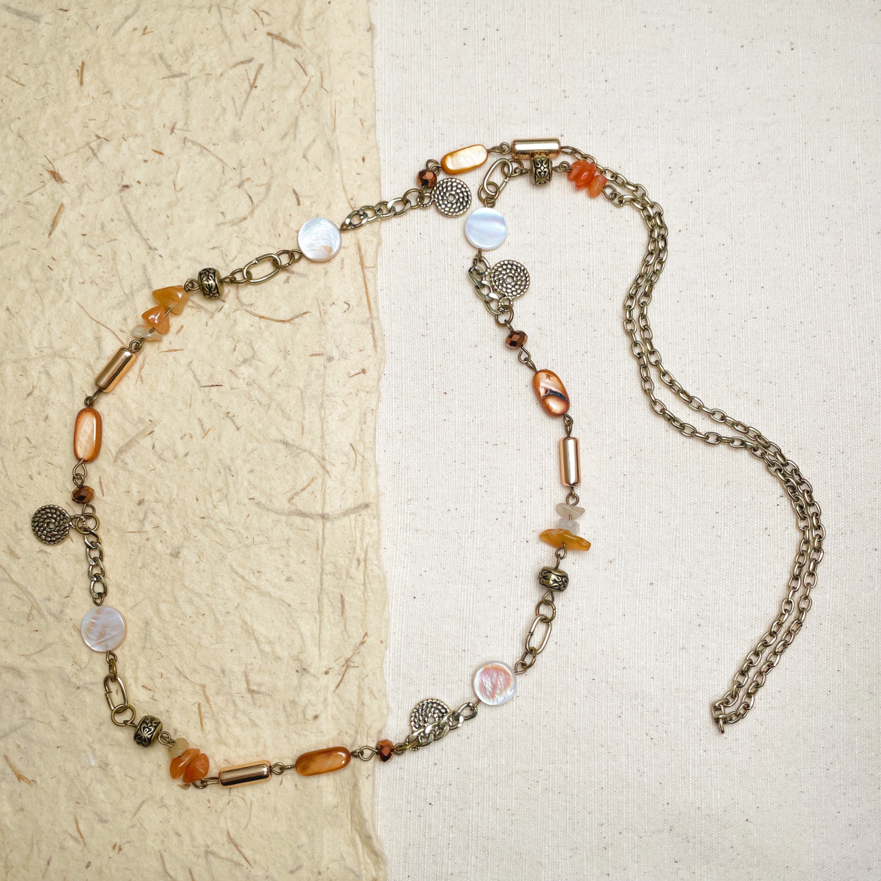 This handmade necklace combines natural gemstones, mother-of-pearl accents, and antique-style metal chains for a timeless boho look. The warm tones of amber, ivory, and brass evoke the grounding beauty of nature and the nostalgia of handcrafted vintage adornments. Each bead and charm adds texture and meaning, celebrating individuality and connection to the earth.